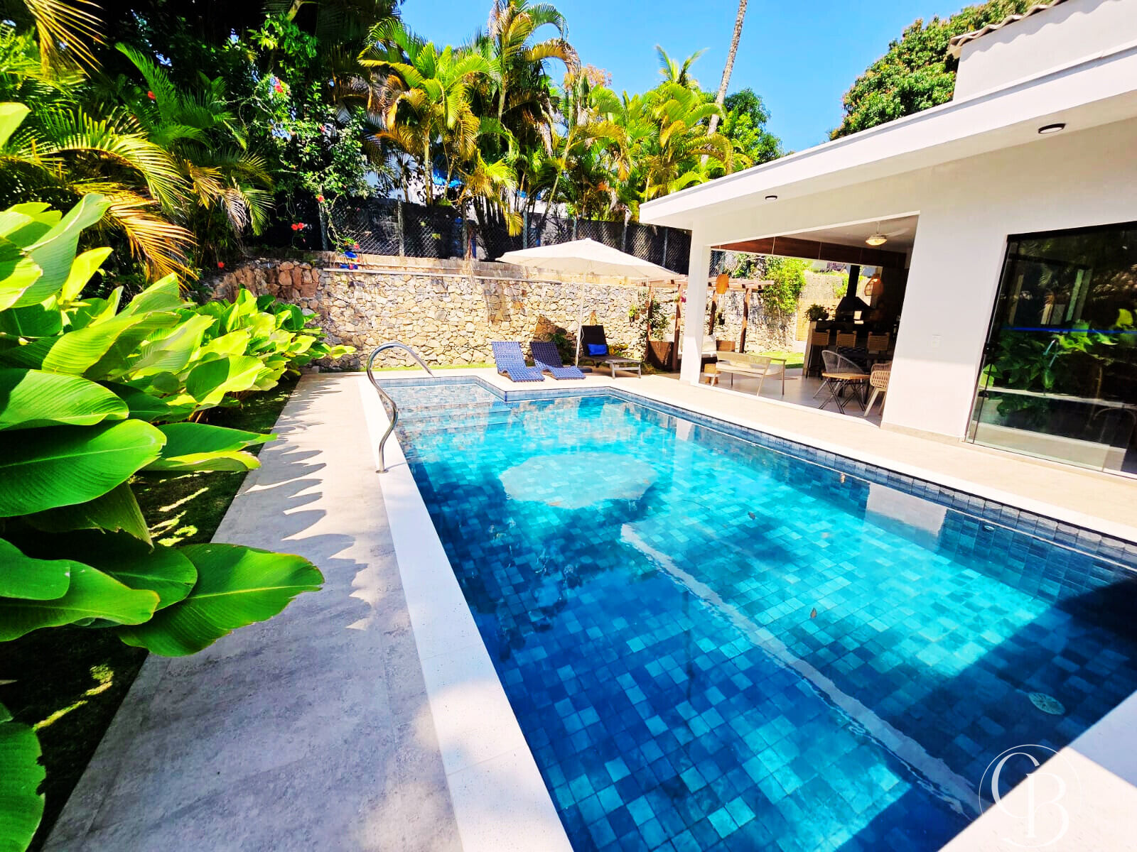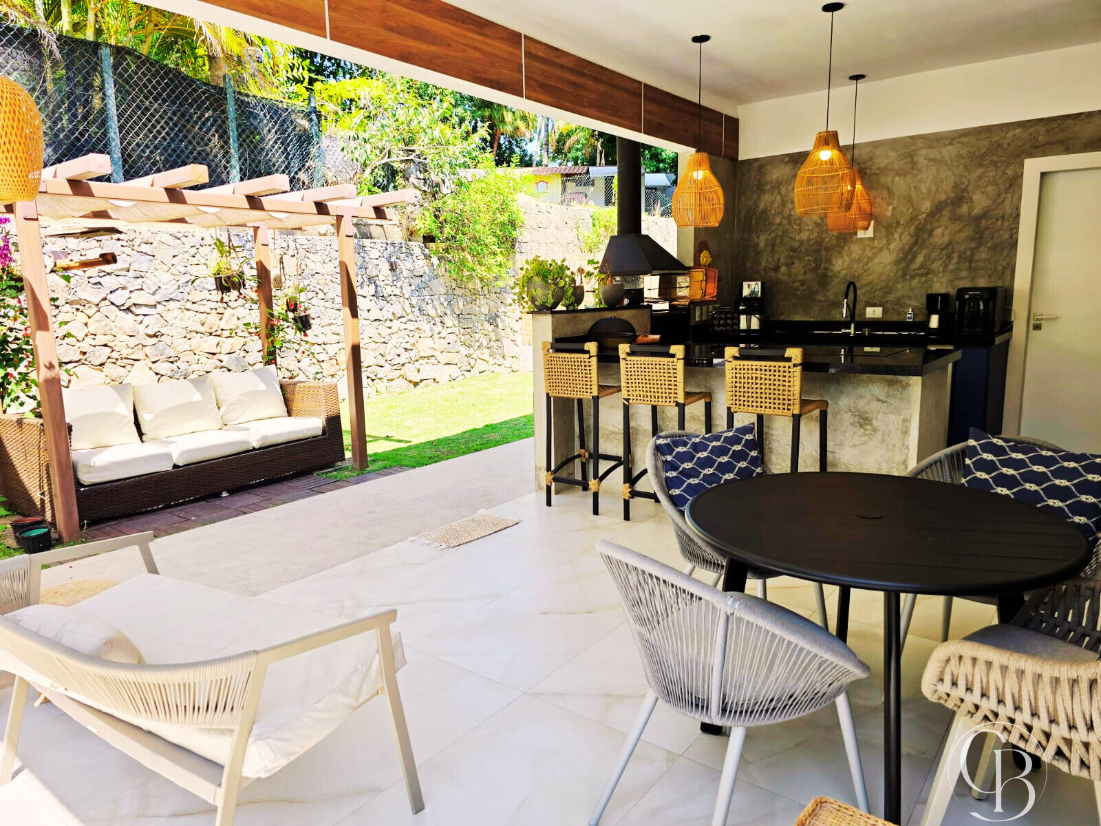 A cozinha gourmet e a copa planejada se destacam pelo excelente acabamento e pelos armários embutidos de alto padrão. O imóvel conta ainda com lavabo, banheiro social externo, piscina com vista para o jardim e uma área verde exuberante que se integra perfeitamente à paisagem, criando uma atmosfera de tranquilidade e bem-estar.