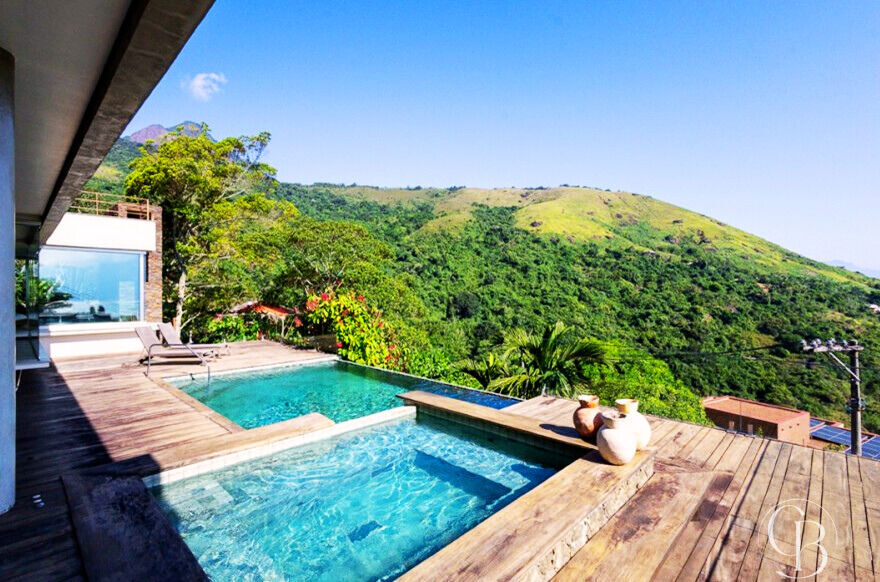 A propriedade conta com uma imponente piscina de borda infinita com pedra natural Hijau, integrada ao horizonte do canal de Ilhabela, além de spa com hidromassagem e cascata, também revestido com pedra natural.