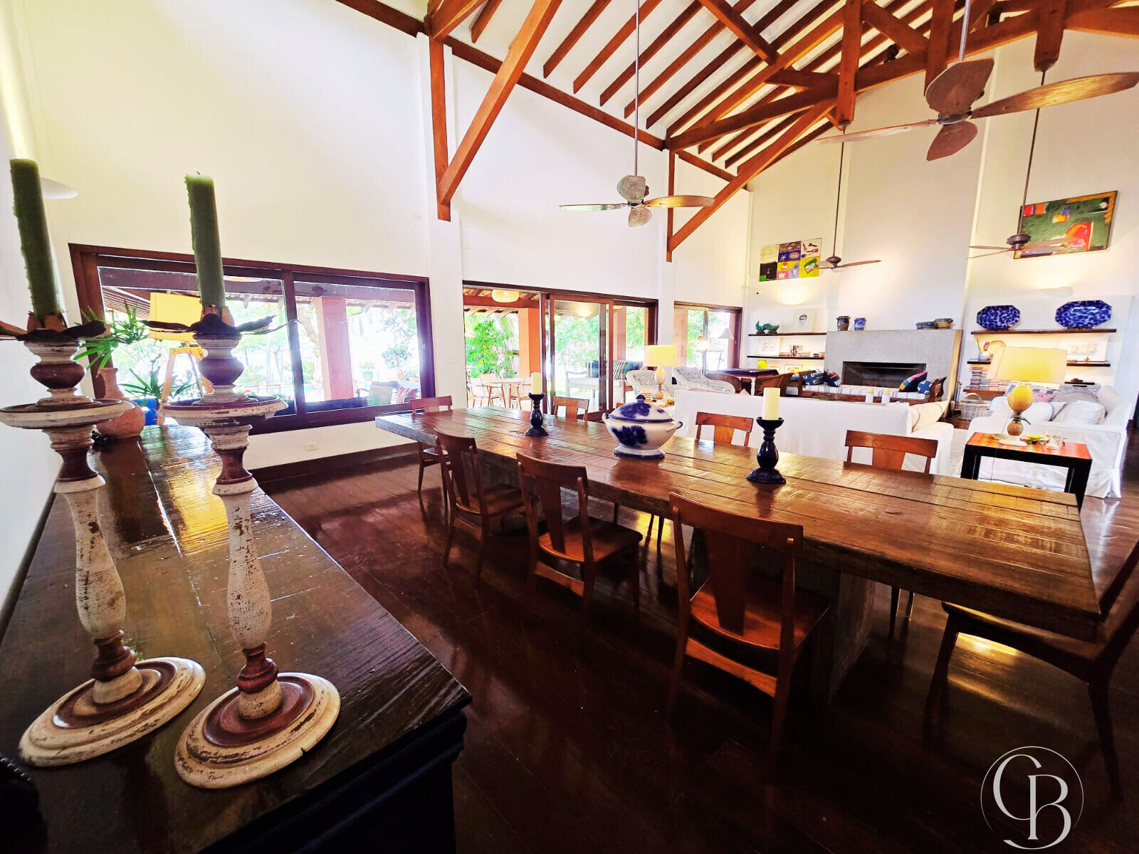 A área social impressiona pela amplitude e aconchego. A sala de estar interna, elegante e acolhedora, conta com lareira, integrada à sala de jantar interna, criando um ambiente fluido e sofisticado. Há ainda lavabo, escritório reservado, além de uma charmosa sala de estar externa, perfeita para contemplar a paisagem natural.