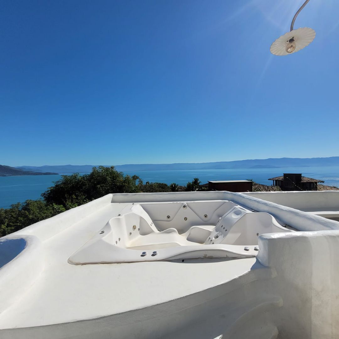 A área social se expande para uma varanda coberta, espaçosa e elegantemente acabada, onde uma jacuzzi aquecida com vista para o mar convida ao relaxamento. O lavabo, que atende tanto os ambientes internos quanto os externos, mantém o padrão sofisticado de acabamento presente em toda a casa.