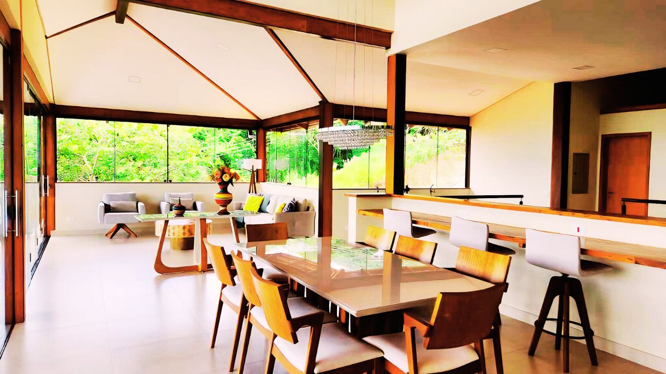 Nas áreas de convivência, a integração é o grande diferencial: a sala de estar, sala de jantar e cozinha se conectam harmoniosamente, e ao abrir as amplas portas de vidro, o ambiente se estende à área de lazer, onde uma piscina e uma charmosa varanda gourmet tornam os momentos ainda mais especiais.