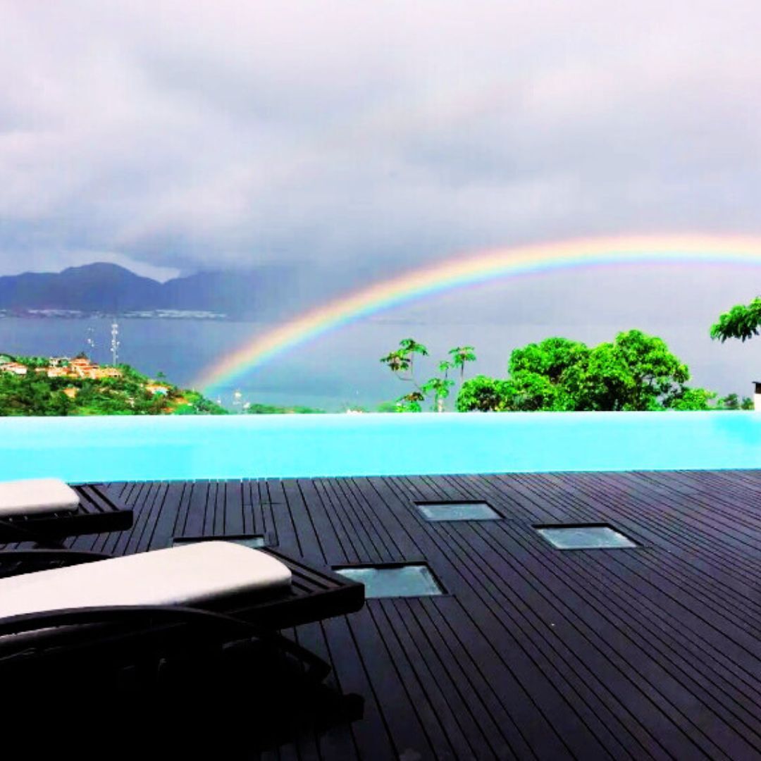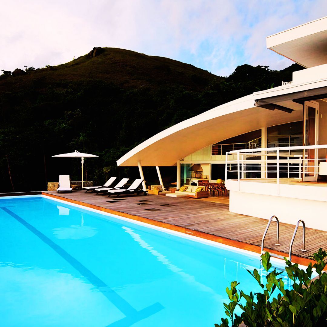 Espaços externos incríveis, incluindo piscina de raia com vista para o mar e montanhas, áreas de estar ao ar livre e um jardim encantador para relaxar ou brincar com seu pet.