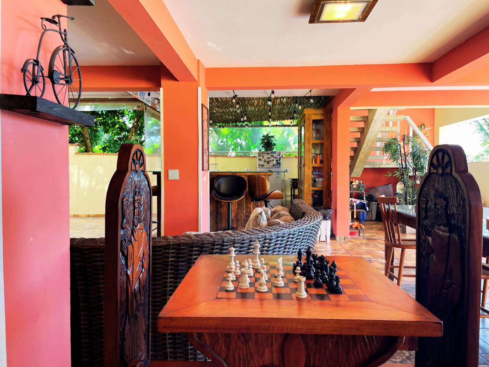 Os ambientes de sala de estar, jantar e cozinha são integrados, criando um espaço aberto e fluido, ideal para momentos de convivência. A casa conta ainda com uma sala de estar equipada com cadeira de massagem, garantindo o relaxamento e bem-estar. Para maior privacidade e conforto, há também uma sala íntima.